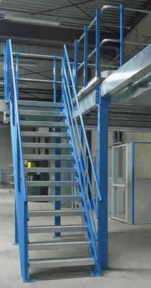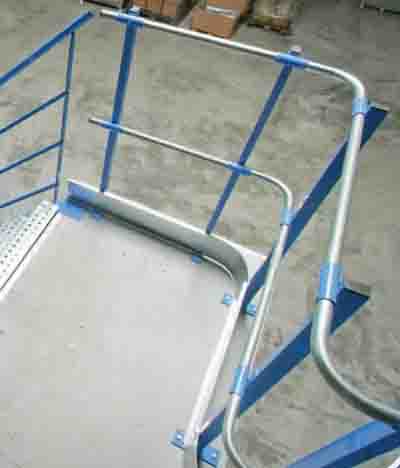 Treppenaufgänge mit Gitterroststufen und Knie und Handlauf, mit oder ohne Zwischenpodest, Stufenabstand max. 190 mm, Stufentiefe 250 mm