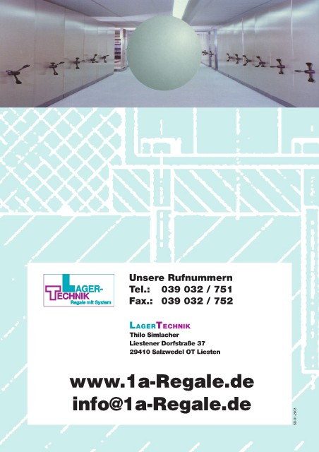 Unsere Rufnummern Tel.: 039 032 / 751 Fax.: 039 032 / 752 LAGERTECHNIK Thilo Simlacher Liestener Dorfstraße 37 29410 Salzwedel OT Liesten www.1a-Regale.de info@1a-Regale.de SD-01-2003